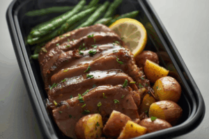 Thick-sliced portobello “steaks” seared and roasted with garlic, thyme, and cracked black pepper, finished with a savory pan drizzle. Served with lemon-garlic green beans and roasted baby potatoes.