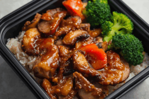 Ginger-garlic portobello slices and crisp vegetables glazed in a shiny teriyaki sauce, served with jasmine rice and sesame broccoli for a classic takeout-style meal prep.